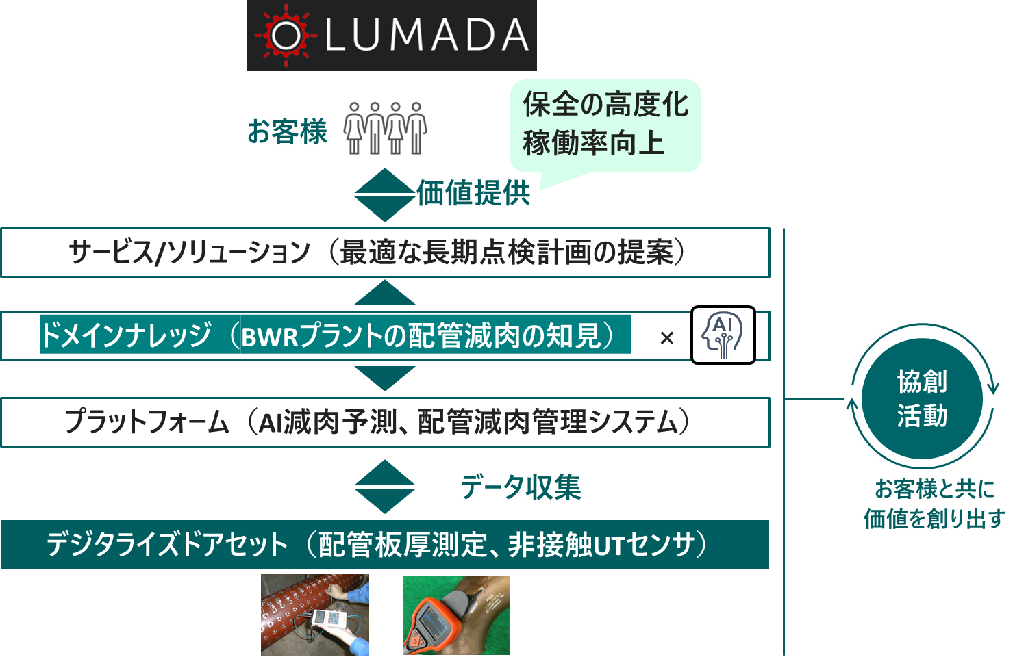 当社は、日立が推進するLumadaの一環として、AIによる減肉リスク予測と非接触UTセンサ(※1)を組み合わせた配管減肉管理を新たに構築し、定期検査の短縮や稼働率・安全性向上に貢献します。