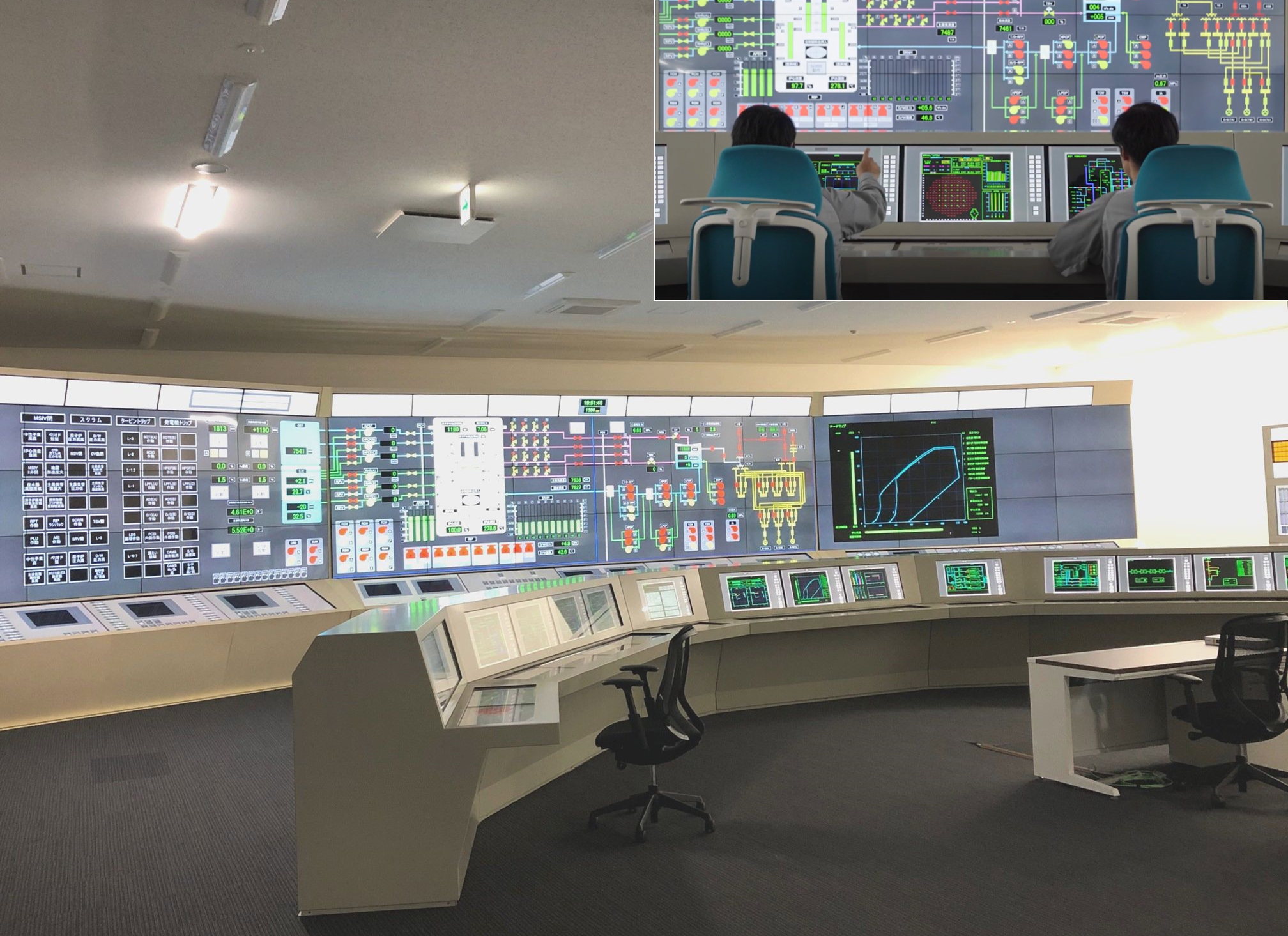 グラストップシミュレータにて中央制御室を模擬することで、プラント起動過程における種々イベントを想定した挙動確認や部署・チームごとの対応訓練を実施しています。